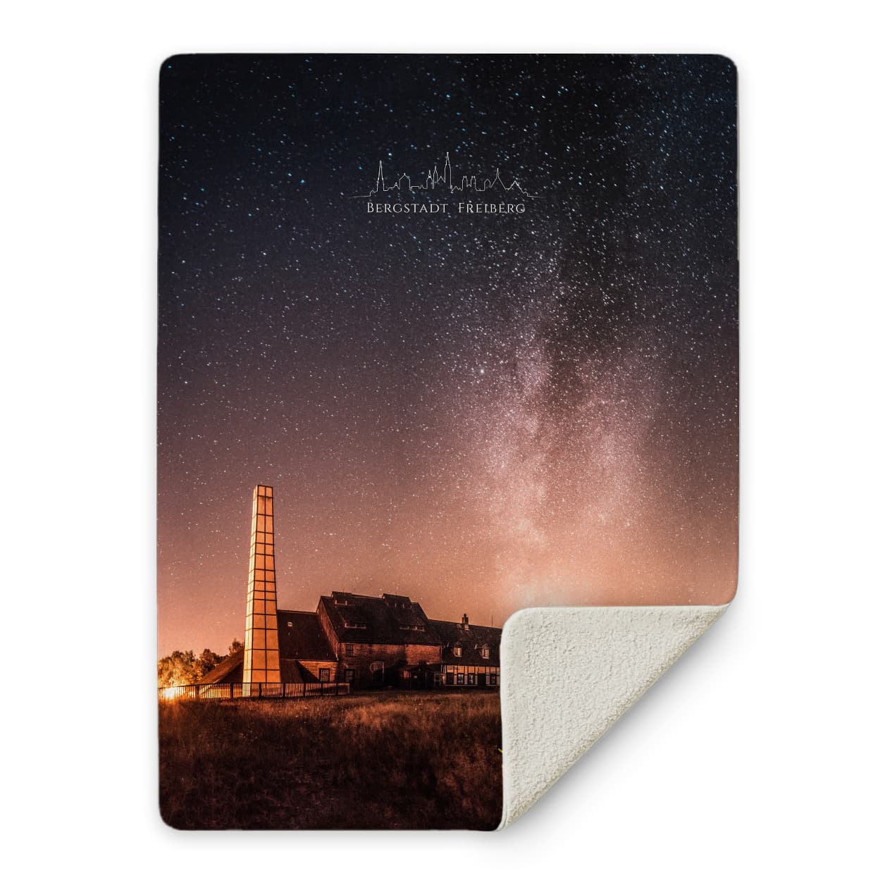 Diese Kuscheldecke zeigt den Komplex der Schachtanlage Alte Elisabeth von der Rückseite mit Blick Richtung Altstadt. Über dem historischen Bergbaugelände wölbt sich die beeindruckende Milchstraße in einem spektakulären Nachthimmel. Der Schriftzug 'BERGSTADT FREIBERG' mit der charakteristischen Skyline macht diese Decke zu einem echten Freiberg-Statement.