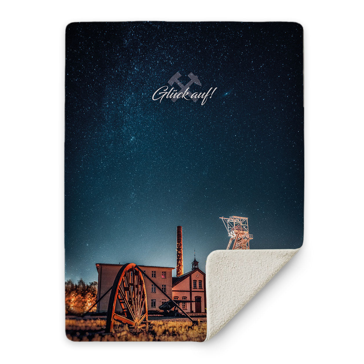 Bergbauromantik unter Sternen! Diese beeindruckende Kuscheldecke zeigt die historische Reiche Zeche unter einem spektakulären Sternenhimmel mit der Milchstraße - gekrönt mit dem traditionellen Bergmannsgruß 'Glück auf' und dem Schlägel-und-Eisen-Symbol.
