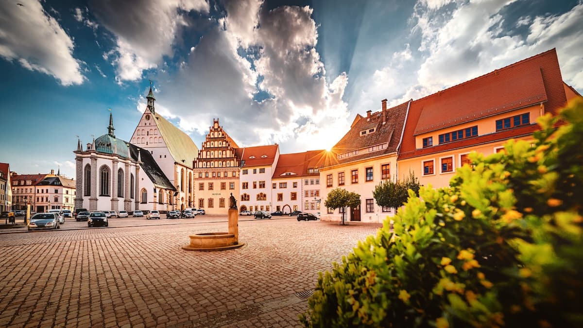 Goldenes Licht am Untermarkt: Die warmen Töne des Sonnenuntergangs tauchen den historischen Untermarkt in ein magisches Licht. Der Dom St. Marien mit seiner charakteristischen Kuppel, das imposante Stadt- und Bergbaumuseum und die bunten Bürgehäuser bilden eine eindrucksvolle Kulisse. Der Gerberbrunnen im Vordergrund und die gelben Blumen rechts verleihen dem Motiv eine lebendige, einladende Atmosphäre. Der dramatische Wolkenhimmel rundet diese stimmungsvolle Aufnahme ab.