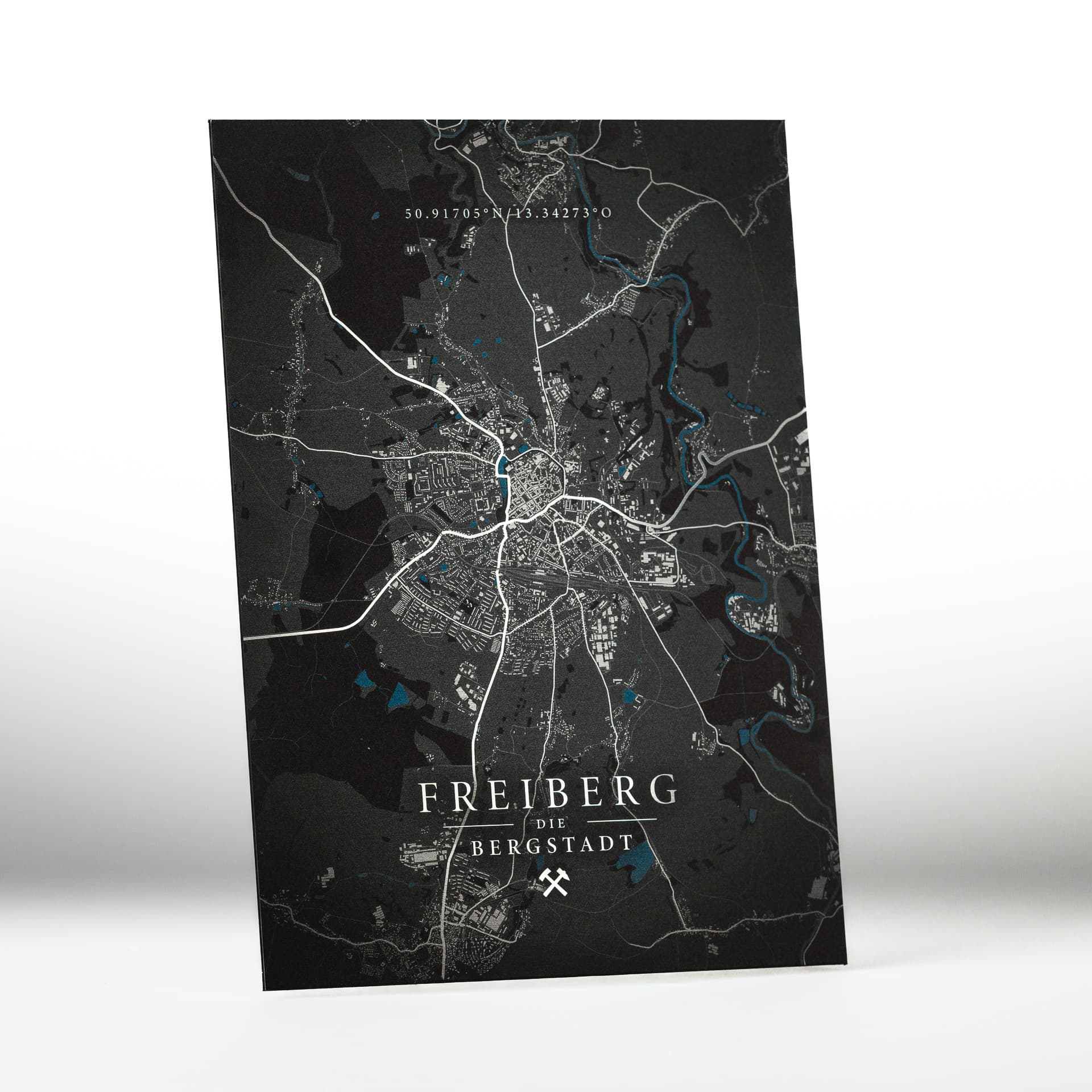 Ideal für Motive wie unsere Landkarte, denn das gebürstete Metall passt wie gemacht zur Geschichte der Silberstadt Freiberg.