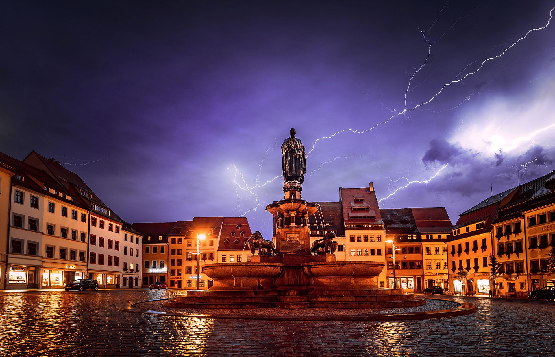 Der Otto-Brunnen auf dem Obermarkt bei Gewitter mit spektakulären Blitzen – eines der Motive, das tatsächlich ein Testfoto ist. Die 350 anderen Fotos, die ich geschossen hatte, hatten keinen einzigen Blitz, und ich war klitschnass.